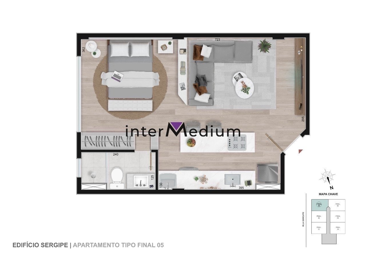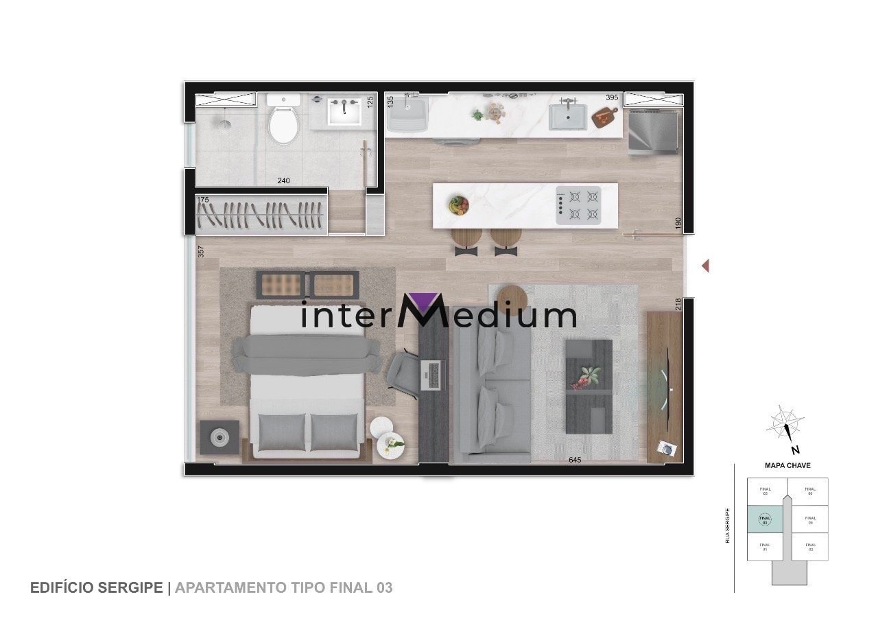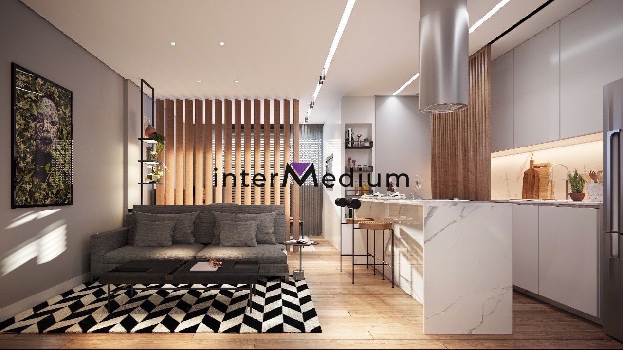 Os apartamentos-studio têm área de 32,43m² a 37,45m². Possuem ambientes integrados, sala e quarto com piso vinílico amadeirado, banheiro com piso em porcelanato e bancada em granito. Na cozinha americana há ilha com previsão elétrica para cooktop.
